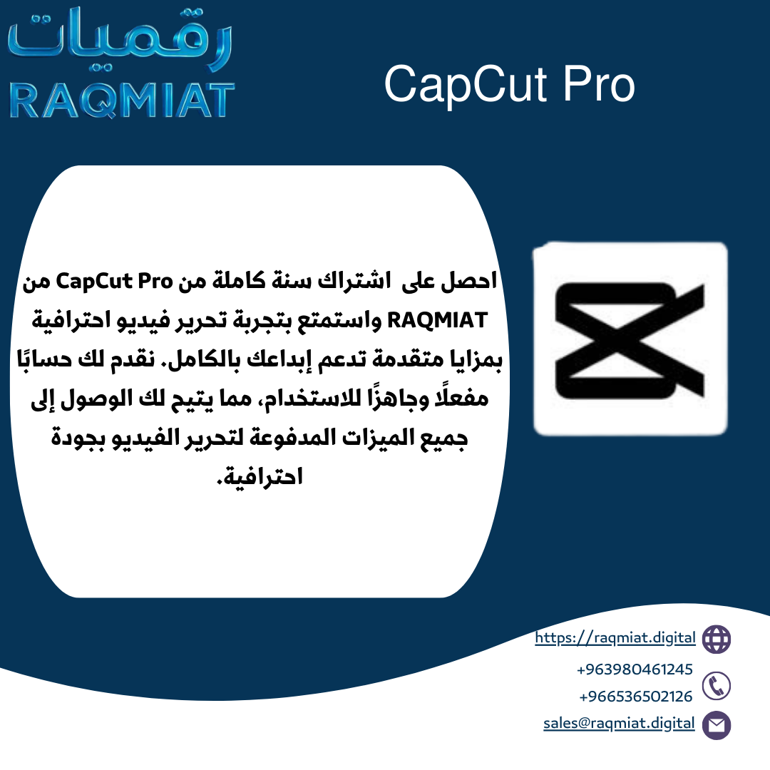 احصل على اشتراك CapCut Pro سنة كامل من RAQMIAT  واستمتع بتجربة تحرير فيديو احترافية بمزايا متقدمة تدعم إبداعك بالكامل. نقدم لك حسابًا مفعلًا وجاهزًا للاستخدام، مما يتيح لك الوصول إلى جميع الميزات المدفوعة لتحرير الفيديو بجودة احترافية.